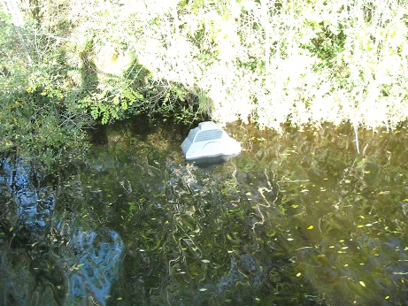 Vor dem Steinkanal fanden sich Steuerbordseits seltsam anmutende graue Gegenstände im Wasser. Bei vorsichtiger Vorbeifahrt entpuppte sich das Ganze als ein weggeworfener Fernseher. Hundert Meter weiter schon der zweite.