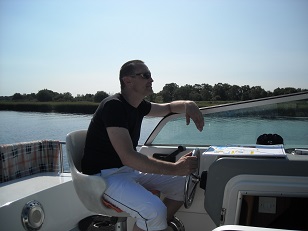 Berührung von statten......ganz so als hätte er sein Leben lang nichts anderes gemacht, außer Hausboot fahren!